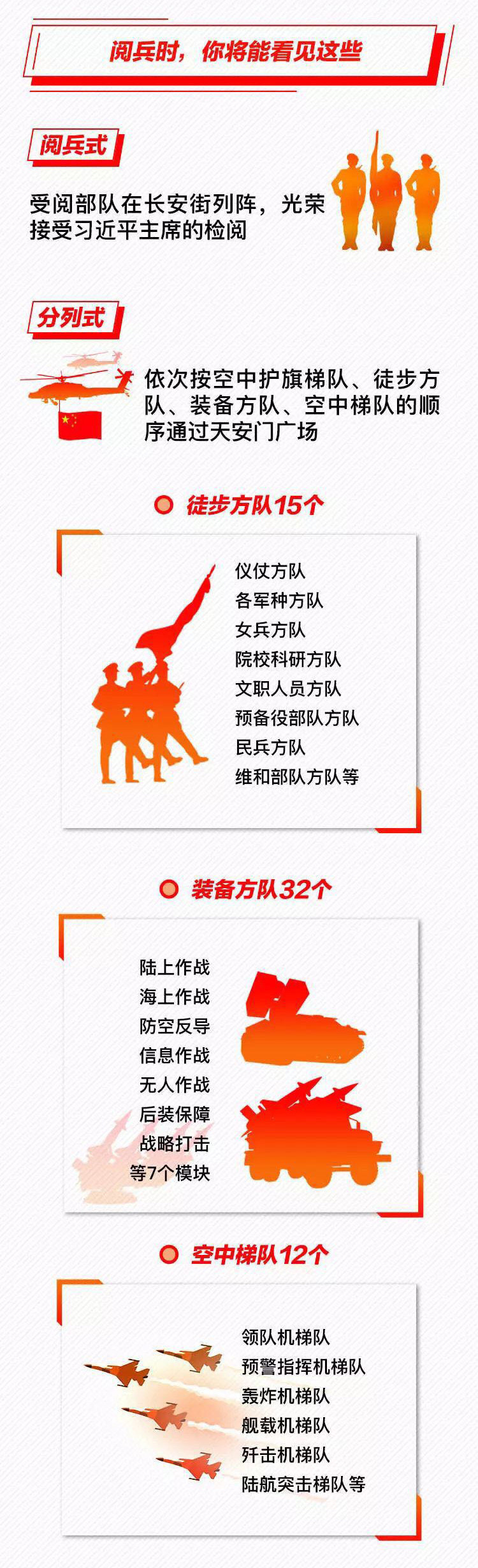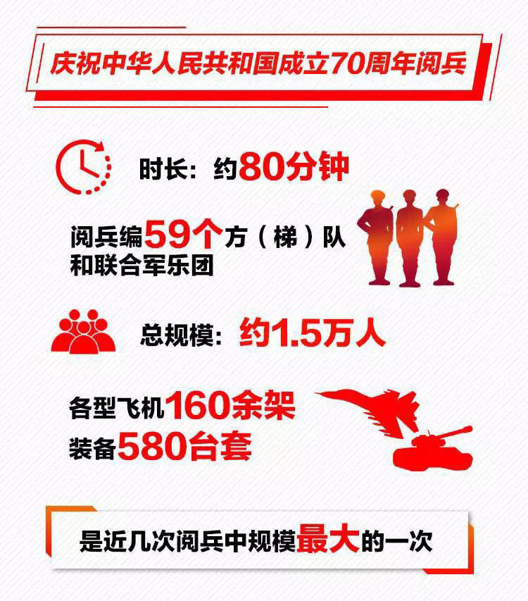 為慶祝新中國(guó)成立70周年,10月1日北京天安門(mén)廣場(chǎng)將舉行盛大閱兵式。屆時(shí),32個(gè)裝備方隊(duì)、12個(gè)空中梯隊(duì)將通過(guò)天安門(mén)廣場(chǎng),接受檢閱。此次閱兵,所有受閱裝備均為國(guó)產(chǎn)現(xiàn)役主戰(zhàn)裝備,其中包括我軍部分新型裝備,是近幾次閱兵中規(guī)模最大的一次。