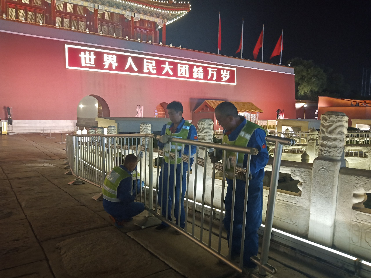 閱兵及群眾慶?;顒?dòng)結(jié)束后,10月2日從凌晨1點(diǎn)開始到6點(diǎn)半結(jié)束,從早上7點(diǎn)半到10點(diǎn)結(jié)束,組織近500人分別完成天安門及廣場周邊地區(qū)、金水橋護(hù)欄全面恢復(fù)。