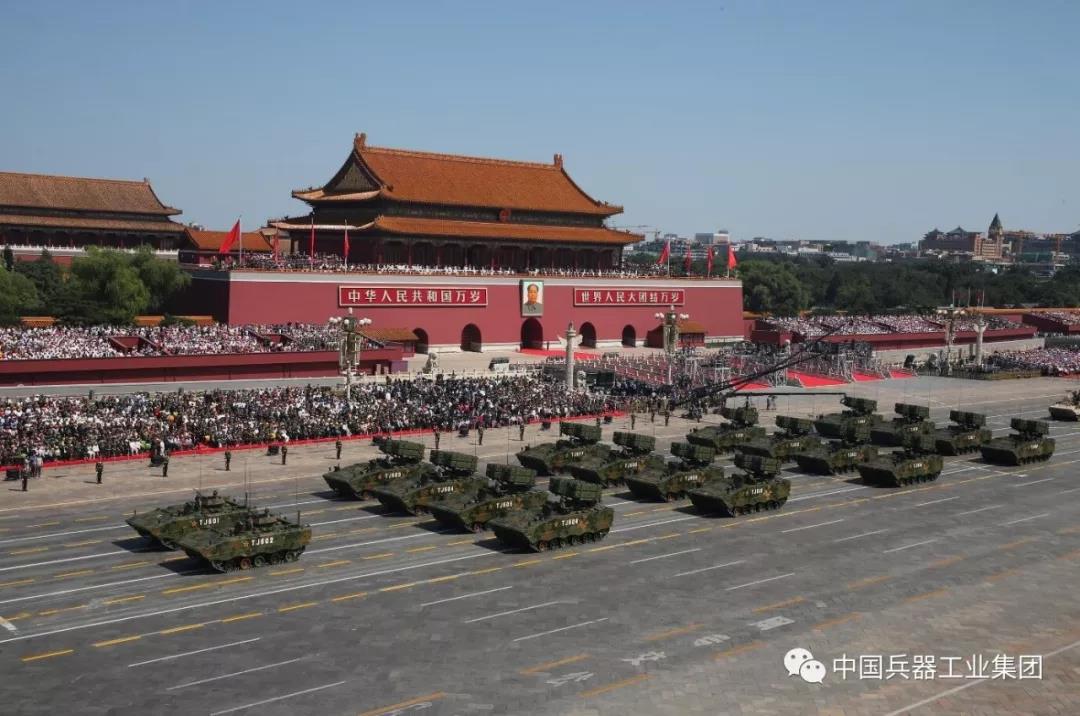 2015年9月3日,紀(jì)念抗戰(zhàn)勝利70周年閱兵在天安門廣場舉行,接受檢閱的27個裝備方隊中,兵器工業(yè)集團(tuán)研制生產(chǎn)的裝備占到13型,99A主戰(zhàn)坦克、紅箭10導(dǎo)彈發(fā)射車、11式輪式裝甲突擊車和35毫米自行高炮系統(tǒng)等裝備首次亮相。