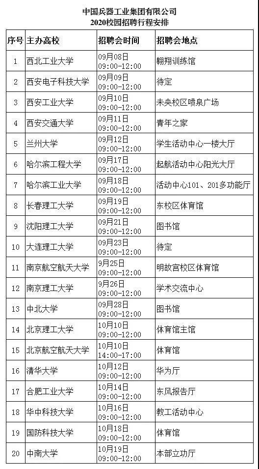 中國(guó)兵器工業(yè)集團(tuán)2020屆校園招聘會(huì)將在全國(guó)12個(gè)城市、20所高校舉辦,招聘會(huì)具體行程見下表: