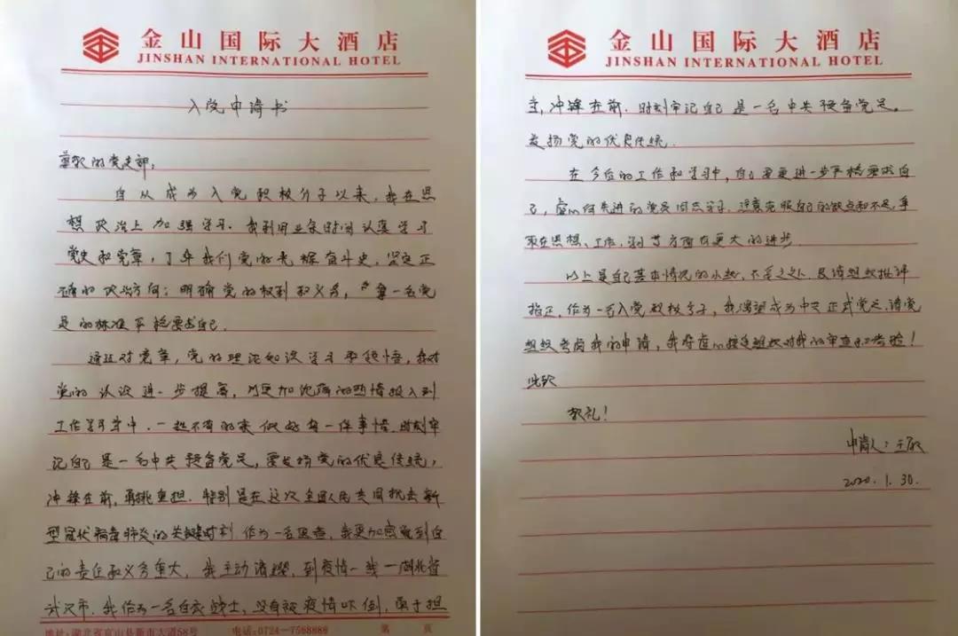 1月30日,在武漢戰(zhàn)“疫”第一線,短短的兩天,讓青年護士王敏、王曉霞最驚訝、最感動的就是防控疫情黨員先行,最危急的關(guān)頭、最危險的地方總有共產(chǎn)黨員沖在前面,“我是黨員我先上”成為最響亮的口號。到達武漢的第二天,她們就向內(nèi)蒙古衛(wèi)健委成立的援助武漢臨時黨支部遞交了入黨申請書。她們表示,要在武漢防疫一線努力工作,向黨員同志學(xué)習(xí)、看齊,以實際行動早日成為一名正式的共產(chǎn)黨員!