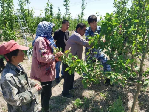 王躍(右一)指導(dǎo)村集體經(jīng)濟(jì)果園工人稀果
