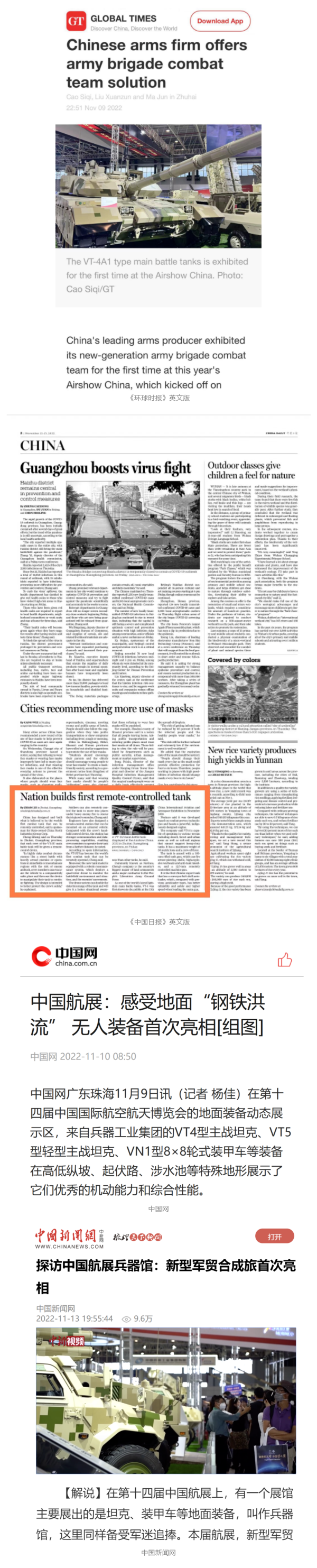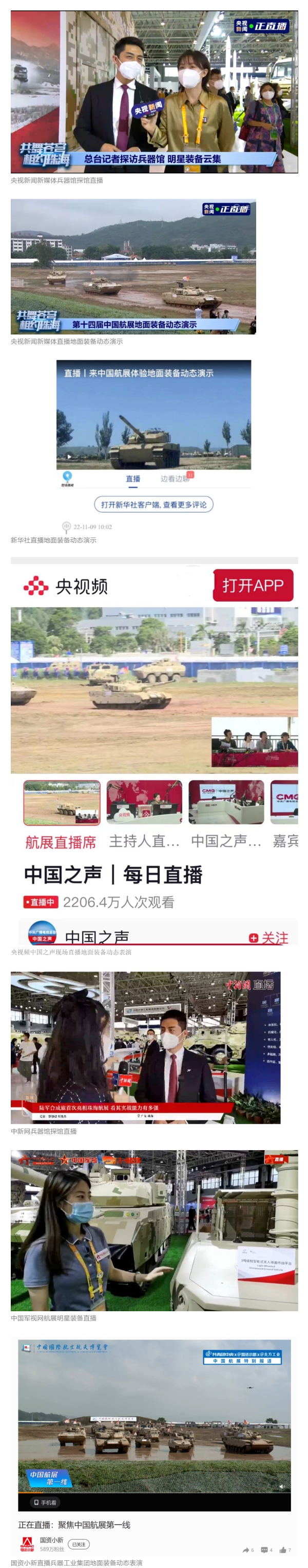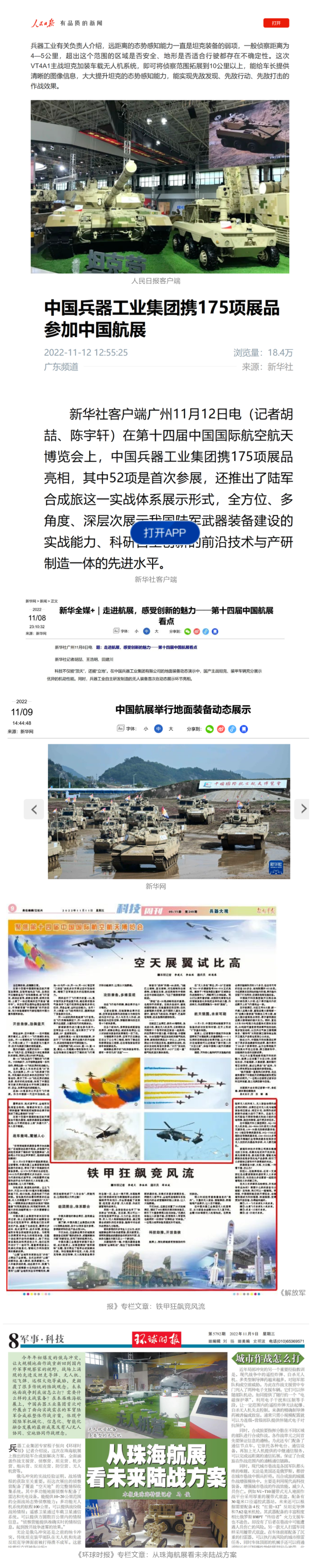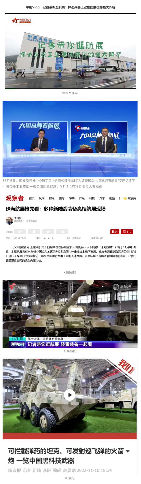 央視國防軍事頻道航展特別報道《炫舞天地間》11月12日《賞“鐵甲雄風(fēng)”!看航展地面裝備“鋼鐵洪流”名場面》對兵器工業(yè)集團(tuán)武器裝備特色亮點進(jìn)行報道?!秶儡娛略鐖蟆?1月7日推出報道《第十四屆中國國際航空航天博覽會明天開幕 中國兵器館首次以陸軍合成旅實戰(zhàn)體系形式展出》,對兵器館陸軍合成旅實戰(zhàn)體系進(jìn)行報道?!盾娛聢蟮馈?1月9日推出《第十四屆中國國際航空航天博覽會 地面兵器裝備首次聯(lián)合陸航直升機(jī)進(jìn)行動態(tài)展示》報道?!盾娒孕刑煜隆?1月9日推出報道《軍迷打卡航展2022》以專業(yè)軍迷視角探館兵器館,全面展示兵器工業(yè)集團(tuán)參展裝備特色亮點。