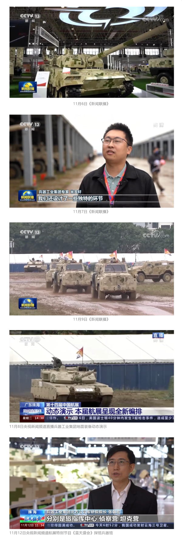 11月6日、7日、9日,央視《新聞聯(lián)播》三次報道兵器工業(yè)集團(tuán)參展情況,重點介紹了集團(tuán)公司總體參展情況、地面裝備動態(tài)演示全新編排、國產(chǎn)輪式反伏擊車首次采用有人駕駛和無人駕駛混合編隊等內(nèi)容。11月8日,央視新聞頻道直播地面裝備動態(tài)演示;11月12日,央視新聞頻道航展特別報道《藍(lán)天盛會》探訪兵器館,采訪兵器工業(yè)集團(tuán)嘉賓對陸軍合成旅作了報道。