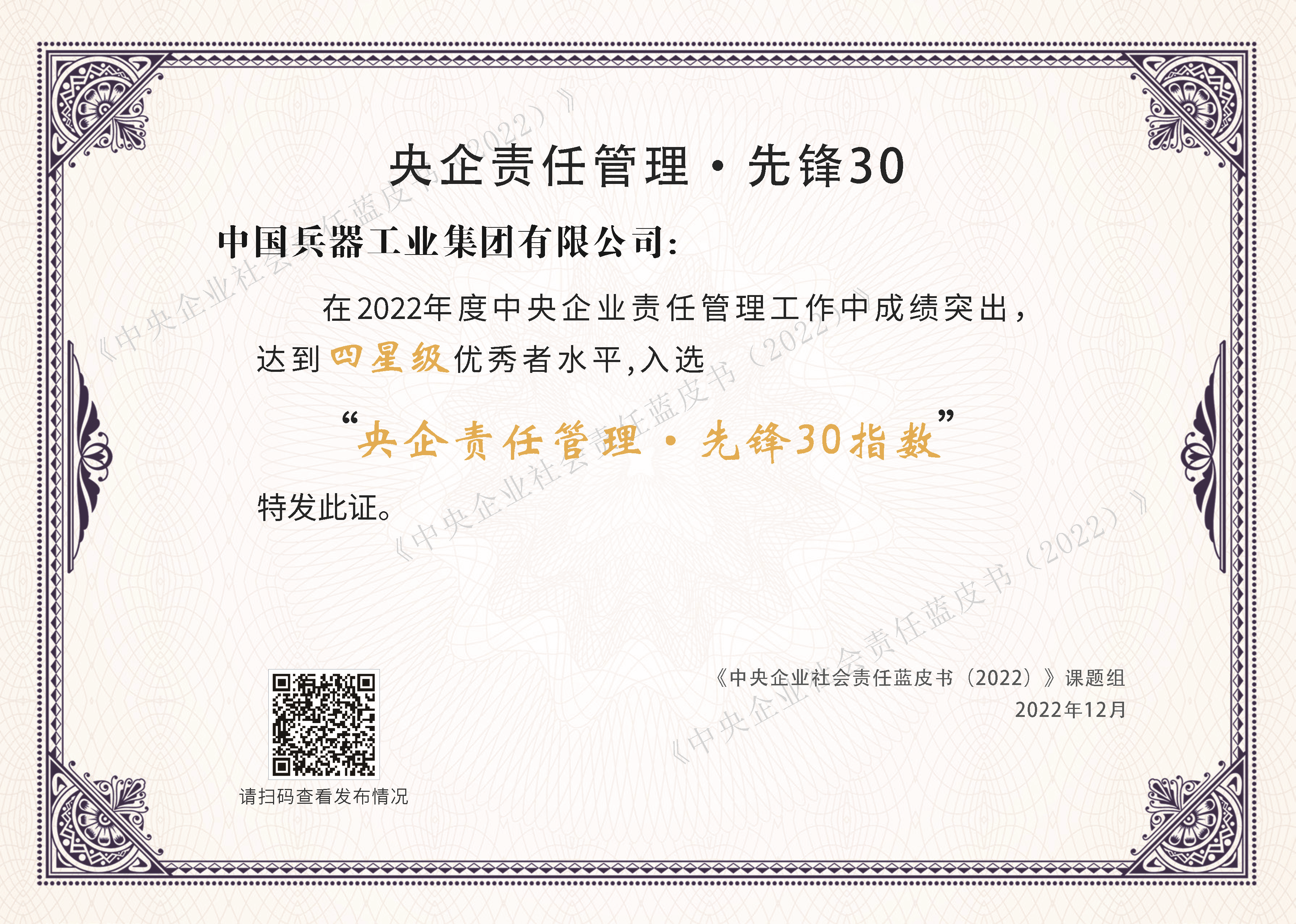 12月20日,由國(guó)務(wù)院國(guó)資委社會(huì)責(zé)任局主辦、中國(guó)社會(huì)責(zé)任百人論壇承辦的“新征程新責(zé)任——《中央企業(yè)社會(huì)責(zé)任藍(lán)皮書(2022)》《國(guó)資國(guó)企社會(huì)責(zé)任藍(lán)皮書(2022)》發(fā)布活動(dòng)”在京召開,國(guó)務(wù)院國(guó)資委黨委委員、秘書長(zhǎng)彭華崗出席并講話?!侗鞴I(yè)集團(tuán)堅(jiān)定不移推進(jìn)綠色低碳發(fā)展》作為優(yōu)秀案例入選《中央企業(yè)社會(huì)責(zé)任藍(lán)皮書(2022)》,充分展示了兵器工業(yè)集團(tuán)在綠色低碳發(fā)展方面的責(zé)任擔(dān)當(dāng)和履責(zé)成效。同時(shí),兵器工業(yè)集團(tuán)責(zé)任管理達(dá)到四星級(jí)優(yōu)秀者水平,成功入選“央企責(zé)任管理·先鋒30指數(shù)”。“央企責(zé)任管理·先鋒30指數(shù)”是對(duì)中央企業(yè)在責(zé)任組織、責(zé)任融合、責(zé)任溝通等方面的建設(shè)情況進(jìn)行綜合評(píng)價(jià)的專項(xiàng)指數(shù),為今年首次發(fā)布。