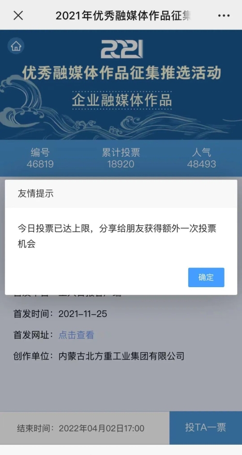 近日,由“文化強國”光明日報協(xié)同推廣平臺、光明網(wǎng)、北京師范大學(xué)新媒體傳播研究中心和光明天翼5G融媒實驗室共同主辦的“2021年優(yōu)秀融媒體作品征集推選活動”開啟線上投票環(huán)節(jié),經(jīng)過專家委員會評審,中國兵器工業(yè)集團北重集團《白楊伴我獻國防》音樂MV入選活動前二十名,并進入網(wǎng)絡(luò)投票環(huán)節(jié)。