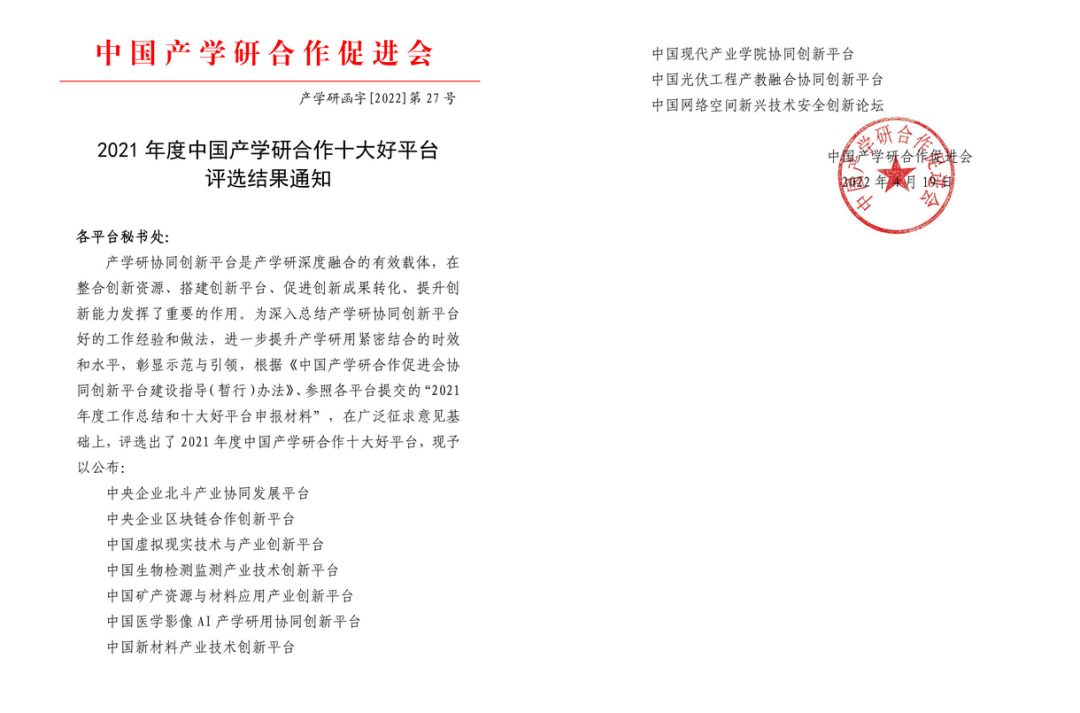 據(jù)了解,中國產(chǎn)學(xué)研合作促進(jìn)會是經(jīng)國務(wù)院批準(zhǔn),由國家發(fā)展改革委、教育部、科技部、工業(yè)和信息化部、生態(tài)環(huán)境部、國務(wù)院國資委、國家知識產(chǎn)權(quán)局、中國科協(xié)、中國科學(xué)院、中國工程院、中華全國總工會、國家自然科學(xué)基金委、國家開發(fā)銀行等相關(guān)部門和一批高校、科研院所、央企、國企、民企等政產(chǎn)學(xué)研界共同參與創(chuàng)辦的全國性社會團(tuán)體。此次入選“中國產(chǎn)學(xué)研合作十大好平臺”的各產(chǎn)學(xué)研協(xié)同創(chuàng)新平臺在整合創(chuàng)新資源、搭建創(chuàng)新平臺、促進(jìn)創(chuàng)新成果轉(zhuǎn)化、提升創(chuàng)新能力方面發(fā)揮了重要作用。
