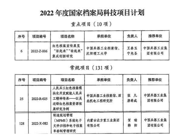 為深入貫徹落實(shí)《“十四五”全國檔案事業(yè)發(fā)展規(guī)劃》要求,著力提升檔案科研自主創(chuàng)新能力,根據(jù)《國家檔案局辦公室關(guān)于開展2022年度國家檔案局科技項(xiàng)目立項(xiàng)工作的通知》要求,中國兵器工業(yè)集團(tuán)檔案館(以下簡稱檔案館)依據(jù)《2022年科技項(xiàng)目立項(xiàng)選題指南》,組織各單位申報(bào)成功三個(gè)檔案科技項(xiàng)目在國家檔案局立項(xiàng),其中一個(gè)項(xiàng)目為國家級(jí)10項(xiàng)重點(diǎn)項(xiàng)目之一,排名第六,這是繼2021年在國家檔案局首次立項(xiàng)三個(gè)項(xiàng)目后的又一重大突破,標(biāo)志著兵器工業(yè)檔案科研工作邁上新臺(tái)階。