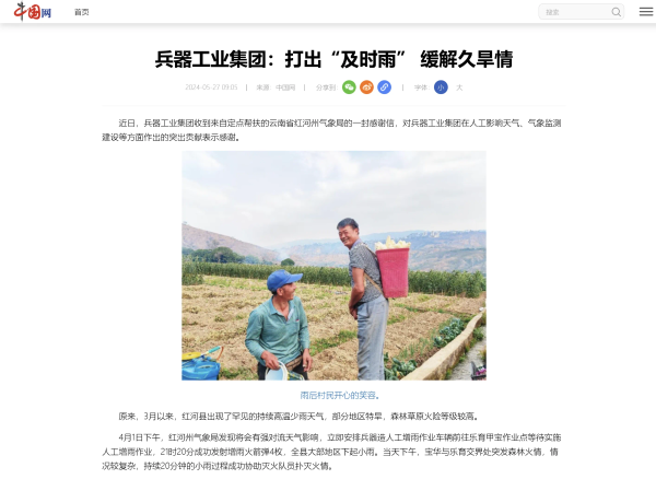 5月27日,中國(guó)網(wǎng)刊發(fā)《兵器工業(yè)集團(tuán):打出“及時(shí)雨” 緩解久旱情》,對(duì)中國(guó)兵器工業(yè)集團(tuán)有限公司助力云南省紅河州人工影響天氣、氣象監(jiān)測(cè)建設(shè)等方面作出的突出貢獻(xiàn)作了報(bào)道。