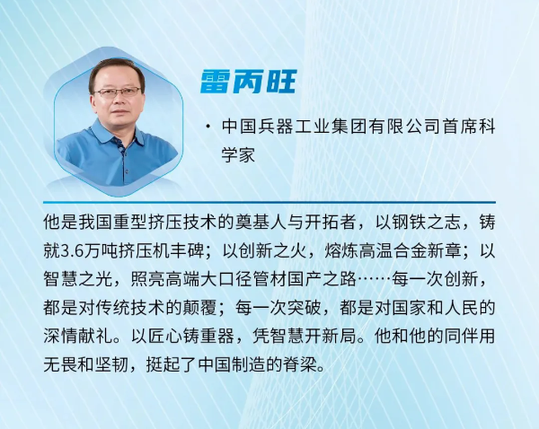 雷丙旺是我國(guó)極端金屬擠壓技術(shù)的開拓者,扎根邊疆地區(qū)國(guó)防特大型企業(yè)工作38年,長(zhǎng)期從事金屬成形制造裝備與工藝研究工作。他研制出我國(guó)極限制造的大國(guó)重器——3.6萬噸黑色金屬垂直擠壓機(jī),一舉打破國(guó)外技術(shù)封鎖,填補(bǔ)國(guó)內(nèi)空白,實(shí)現(xiàn)了超(超)臨界電站核心管道和航空發(fā)動(dòng)機(jī)高壓渦輪盤粉末合金棒材的中國(guó)制造,開發(fā)出成套關(guān)鍵技術(shù),取得一系列原創(chuàng)性成果,促進(jìn)了產(chǎn)業(yè)的融合發(fā)展,創(chuàng)造巨大經(jīng)濟(jì)社會(huì)效益。