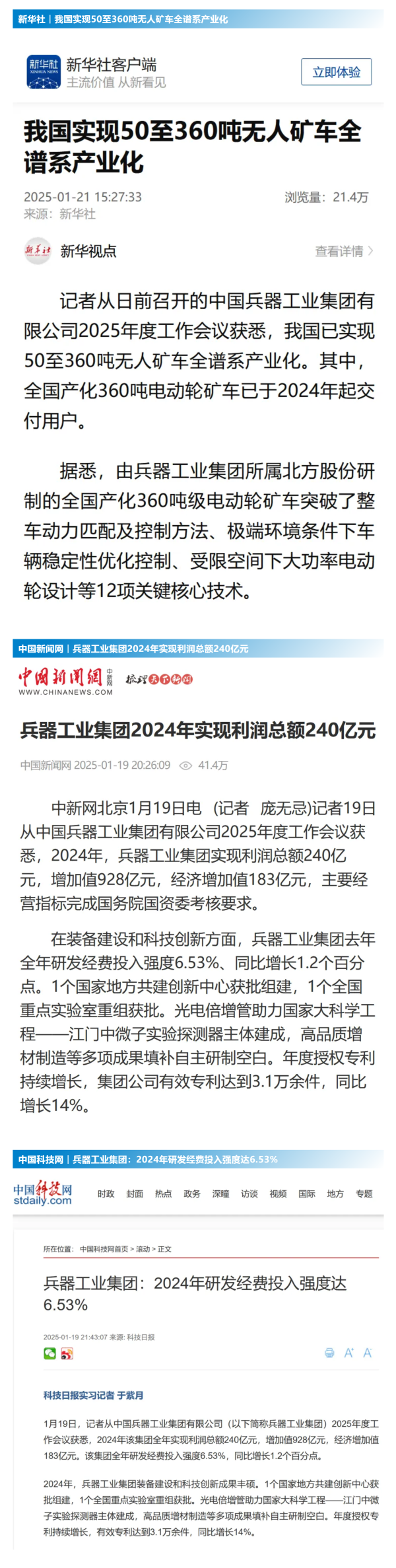 集團(tuán)公司2024年取得的成績(jī)及下一步重點(diǎn)工作受到社會(huì)媒體廣泛關(guān)注。新華社、中國(guó)新聞網(wǎng)、中國(guó)科技網(wǎng)、光明日?qǐng)?bào)客戶端、經(jīng)濟(jì)日?qǐng)?bào)客戶端、中國(guó)日?qǐng)?bào)網(wǎng)、國(guó)務(wù)院國(guó)資委網(wǎng)站、學(xué)習(xí)強(qiáng)國(guó)中央企業(yè)學(xué)習(xí)平臺(tái)、新浪網(wǎng)、網(wǎng)易網(wǎng)、搜狐網(wǎng)、騰訊網(wǎng)、鳳凰網(wǎng)等中央主流媒體、國(guó)家部委網(wǎng)站及知名網(wǎng)絡(luò)媒體對(duì)集團(tuán)公司2025年度工作會(huì)議進(jìn)行了報(bào)道,重點(diǎn)關(guān)注集團(tuán)公司經(jīng)營(yíng)業(yè)績(jī)、科技創(chuàng)新、產(chǎn)業(yè)結(jié)構(gòu)布局優(yōu)化等情況。其中,新華社以《我國(guó)實(shí)現(xiàn)50至360噸無(wú)人礦車全譜系產(chǎn)業(yè)化》為題,重點(diǎn)報(bào)道了集團(tuán)公司在推動(dòng)智能制造水平提升方面取得的成效;中國(guó)新聞網(wǎng)、光明日?qǐng)?bào)客戶端、經(jīng)濟(jì)日?qǐng)?bào)客戶端、中國(guó)日?qǐng)?bào)網(wǎng)等就集團(tuán)公司2024年度經(jīng)營(yíng)業(yè)績(jī)及各項(xiàng)工作取得的成果進(jìn)行報(bào)道;中國(guó)科技網(wǎng)著重報(bào)道了集團(tuán)公司在科技創(chuàng)新和優(yōu)化產(chǎn)業(yè)結(jié)構(gòu)布局方面的最新進(jìn)展。集團(tuán)公司門戶網(wǎng)站、微信公眾號(hào)、微博等新媒體平臺(tái)以及《中國(guó)兵工報(bào)》也對(duì)集團(tuán)公司工作會(huì)議進(jìn)行了及時(shí)報(bào)道,各成員單位紛紛對(duì)相關(guān)內(nèi)容進(jìn)行轉(zhuǎn)載,引發(fā)全系統(tǒng)關(guān)注。